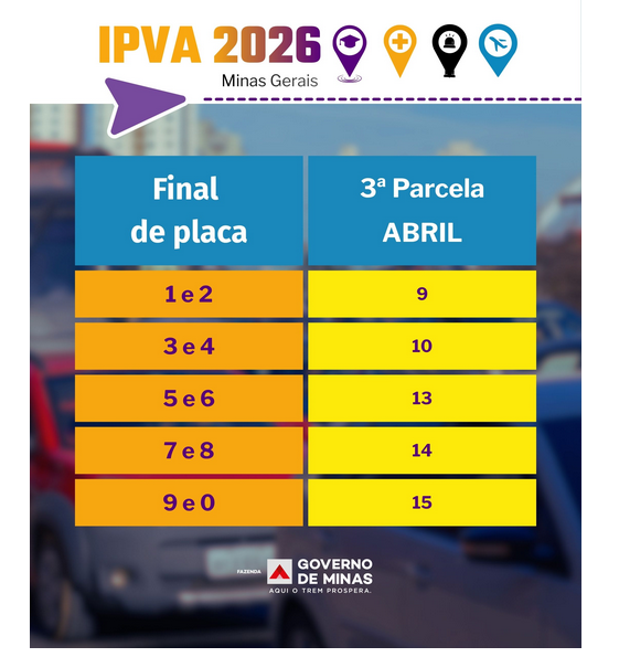 Começa nesta quinta-feira (9/4) a escala de vencimentos da terceira parcela do Imposto sobre a Propriedade de Veículos Automotores (IPVA) de 2026, em Minas Gerais. De acordo com o final da placa, os pagamentos devem ser feitos até o dia 15 de abril.
